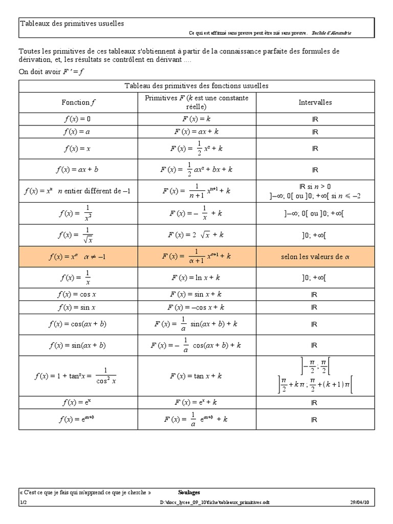 Soit f une fonction définie sur un intervalle i. Tableau des primitives des fonctions usuelles. Les calculs de dérivées effectués dans les chapitres précédents nous permettent de dresser le tableau suivant. F ' est la dérivée de.