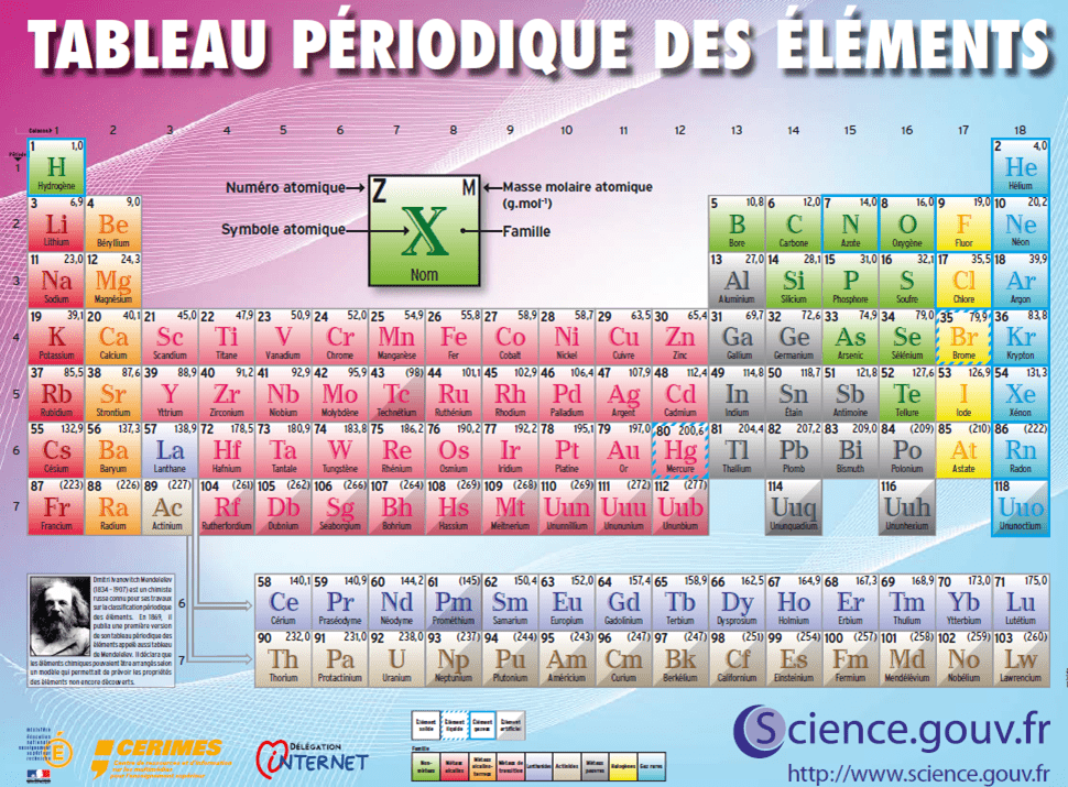 (chimie) tableau présentant la liste des éléments chimiques ordonnés par numéro atomique croissant et. Connaître la tableau périodique des éléments par cœur n'est pas d'une grande utilité. Le tableau périodique des éléments contient des informations sur chaque élément chimique.