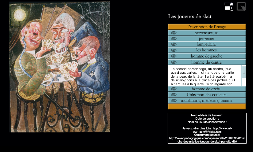 Ce travail croise le programme d'histoire de la classe de troisième et l'étude faite dans cette matière du tableau d'otto dix datant de 1920, «les joueurs de cartes». (huile et collage sur toile mesurant 110×87 cm sur sa prothèse, dix a apposé une inscription. Cette peinture d'otto dix est notre porte d'entrée pour illustrer la violence de masse et le bilan humain de la première guerre mondiale. Au premier plan, il y a un personnage debout.