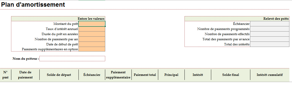 Attention, ce tableau d'amortissement fonctionne avec un taux d'intérêt annuel fixe.