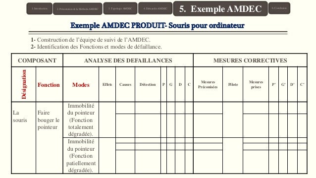 Amdec est la traduction de l'anglais fmeca (failure modes, effects and criticality analysis, litt. L'étude amdec d'un système est une méthode qui permet de faire une analyse très complète des modes de défaillance de composants, de leurs causes, et de leurs effets sur le système. Le tableau amdec regroupe toutes les actions préventives et correctives que le groupe a décidé de 2.