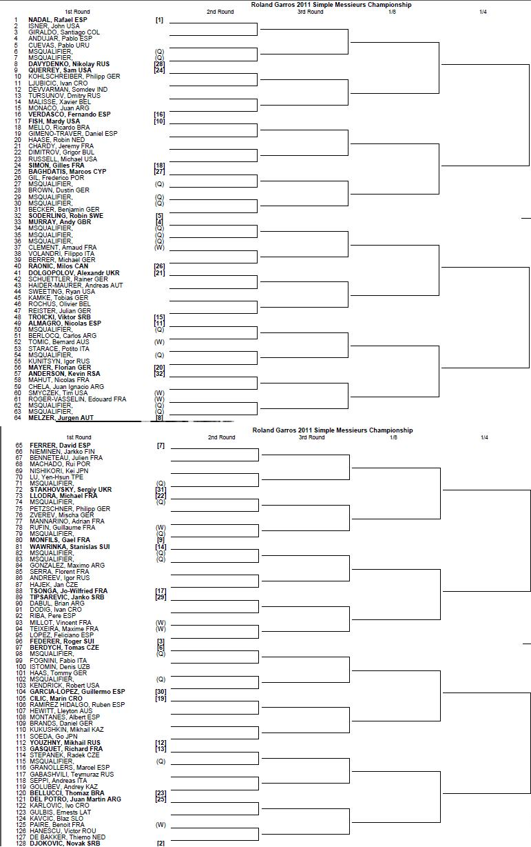 Le tableau complet de roland garros, toutes les statistiques,les dernières actus, les derniers résultats et les prochaines rencontres. Du 27 septembre au 11 octobre. Forfait de milos raonic, le tableau dévoilé. Sur cette page, le tableau complet des premiers tours en simple (.)