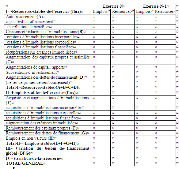 Refers to person, place, thing, quality, etc. Le tableau de financement est un tableau des emplois et des ressources qui explique les variations du patrimoine de l'entreprise au cours de la période de référence. En effet, ce tableau de financement est, à la fois, le constat financier d'une bonne ou d'une mauvaise gestion et le point de départ aux projections financières indispensables pour dans sa première partie, le tableau de financement va s'intéresser, tout particulièrement, aux postes comptables à long terme.